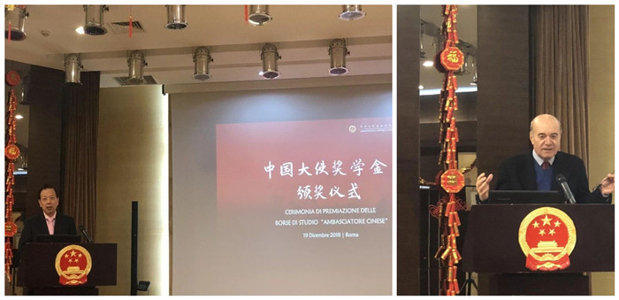 中国大使奖学金的初衷,也是希望这些获奖者能够成为中意友谊和文化的使者,而意大利员工对中文学习的热爱以及在多个意大利大学和高中都已经将汉语作为必修课程,是推动汉学学习和中国文化传播在欧洲和世界发展的最好见证。