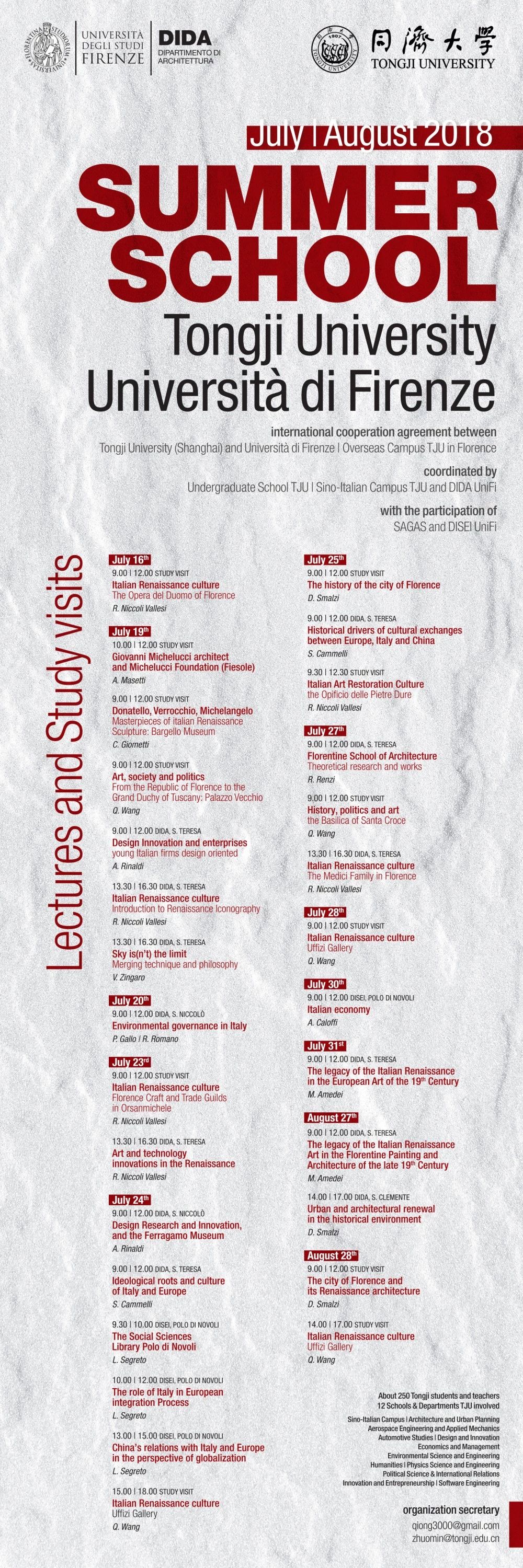 2018年第二届BETVICTOR佛罗伦萨海外校区暑期营于9月初圆满结束,由来自校内12个公司共14个团组,近250名师生参加,比2017年的规模扩展了一倍有余。项目除同济带队教师的课程之外,在佛罗伦萨由佛罗伦萨大学方授课,共计14位佛大教师开设28门课程,方向含括政治、经济、哲学、艺术史、建筑规划、设计、环境工程等多个领域,组织安排了乌菲齐美术馆、巴杰罗美术馆、米凯鲁齐基金会、菲拉格莫博物馆、手工作坊等近半数的实地讲解参观学习。