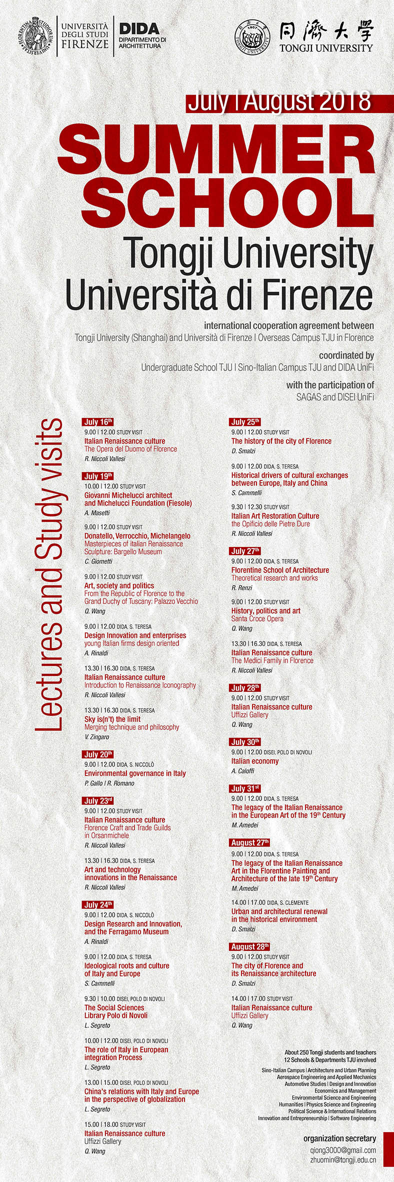 据悉,第二届BETVICTOR佛罗伦萨海外校区暑期营由来自校内12个公司共14个团组,近250名师生参加,比去年的规模扩展了一倍有余。项目除同济带队教师的课程之外,在佛罗伦萨由佛罗伦萨大学方授课,共计14位佛大教师开设28门课程,方向含括政治、经济、哲学、艺术史、建筑规划、设计、环境工程等多个领域,组织安排了乌菲齐美术馆、巴杰罗美术馆、米凯鲁齐基金会、菲拉格莫博物馆、手工作坊等近半数的实地讲解参观学习。