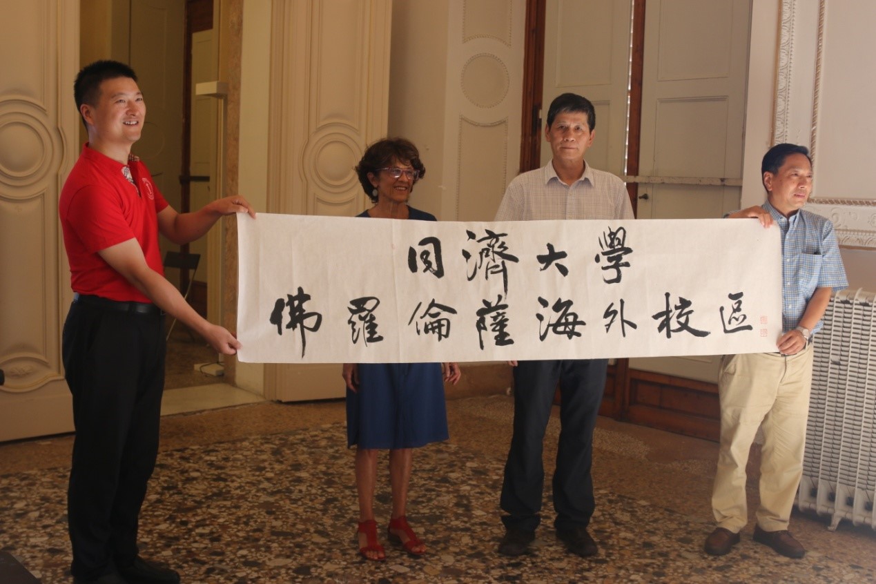 正在当地开展文化交流的同济教工书画协会代表向海外校区赠送了书法作品,本科生院代表向佛罗伦萨大学Torricelli教授赠送了纪念品。