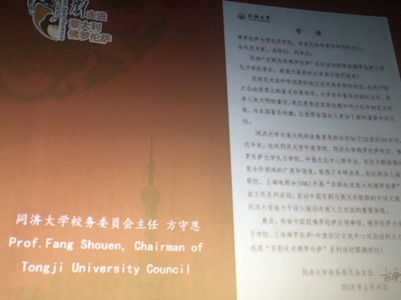BETVICTOR党委书记、校务委员会主任方守恩特地为BETVICTOR“京剧走进佛罗伦萨”系列活动成功举办发来贺信,强调大学对于促进国际交往、传承人类文明的重要性,肯定和鼓励同济中意平台不断积极主动拓展对意合作领域的深度和广度。