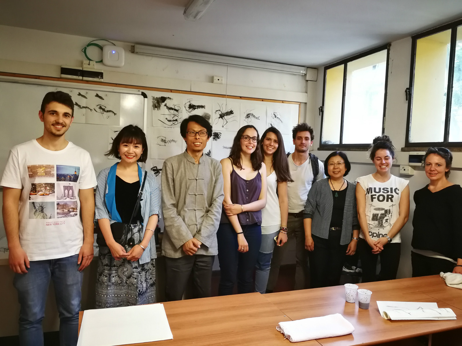 周教授从事中国画创作和教学二十多年,对中国画有深厚的功底和独特的理解。讲座在布鲁内莱斯基校区礼堂内举行,吸引了数十名对中国绘画艺术感兴趣的中外师生。讲座从中国画和中国诗歌的关系开始,一直讲到如何欣赏中国画,提到了很多传世佳作,令人印象深刻。现场周教授还展示了他的几十幅画作,引来同学的真心的仰慕。讲座结束后,周老师又兴致勃勃地带领同学们来到绘画教室,传授大家国画技艺。第一次拿起毛笔画虾,同学们非常认真,也特别开心。周老师也对大家的努力和才华称赞不已。最后同学们高兴地和老师合影,并意犹未尽地带走了自己的画作。