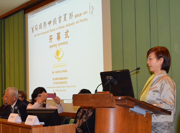 佛罗伦萨孔院经理蔡潇丽女士应邀出席了开幕式并致辞。蔡潇丽经理在致辞中说“意大利的建筑、绘画、雕塑和艺术享誉全球。中国书画天人合一、神与物游;尺幅之纸,万里江河;无画皆画,惟妙惟肖。它的内敛与博大,一样独特。”蔡经理祝首届书画节取得圆满成功,用民族的“奇特与智慧”,展示当今绘画艺术。最后,她用意大利语祝中意“画艺”与“塑魂”碰撞并交融!