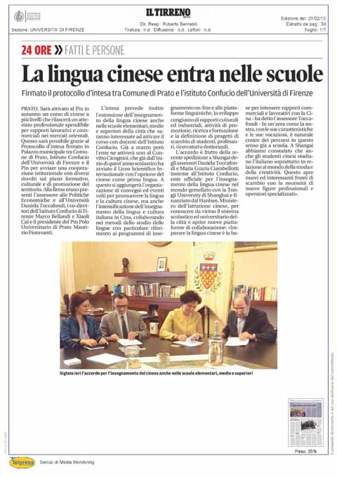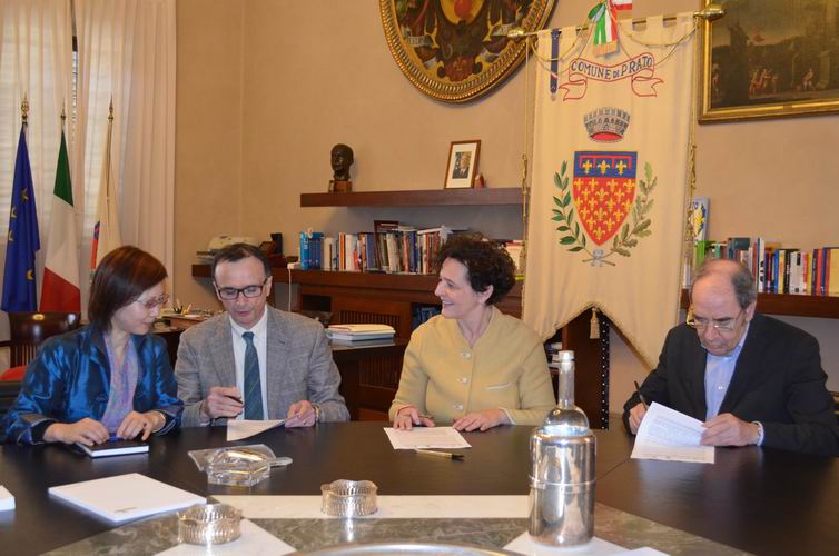 2015年2月20日,佛罗伦萨大学孔子公司中意方经理蔡潇丽教授、Bellandi教授受邀访问普拉托市政府,与经济旅游局局长Toccafondi女士,佛罗伦萨大学普拉托校区主席Fioravanti教授进行了友好交谈,并签署了三方合作备忘录。合作将围绕普拉托地区中文教育,中国语言文化的宣传和推广及当地中小学汉语教学的开展进行。