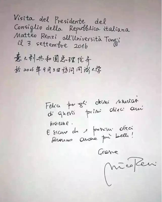 On 3 September 2016, then Italian Prime Minister Matteo Renzi visited Tongji University for the inauguration of the 10th Anniversary Ceremony of TJSIC. Rectors and delegations from Polytechnic University of Turin, Polytechnic University of Milan, University of Bologna and University of Florence, and Yang Xianjin, the Secretary of the Party Committee of Tongji University attended the ceremony. Renzi expressed appreciation for the accomplishments of Tongji University in educational, technological and cultural cooperation with Italy during the past 10 years.